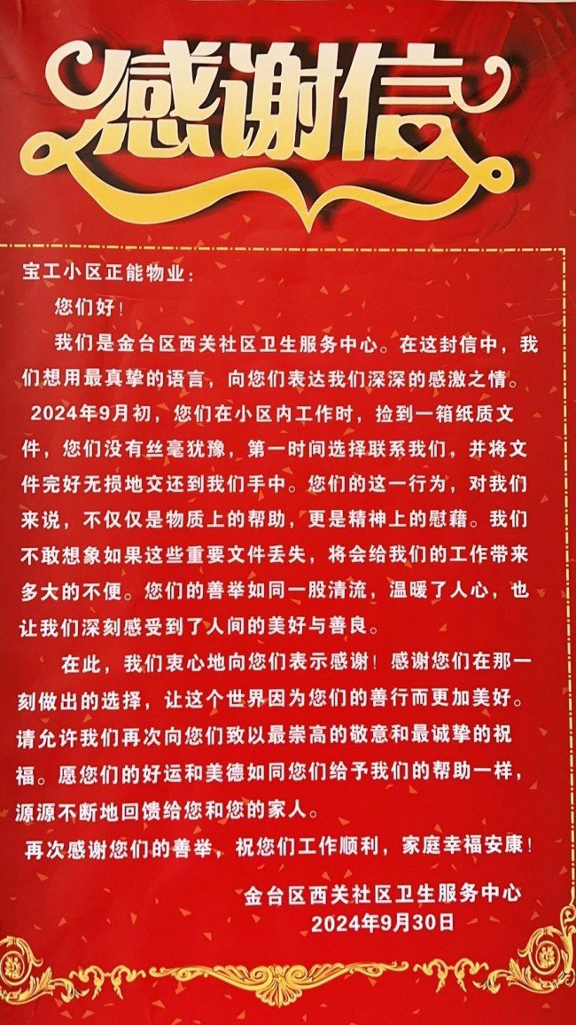 近日,宝鸡国资正能实业发展beat365官方网站宝工小区物业办,收到了来自金台区西关社区卫生服务中心送来的“优秀团队 品德高尚”字样的大红锦旗,以及一封饱含深情的感谢信。这一切源于一次看似平凡的日常保洁工作,保洁员在打扫卫生时意外捡到了社区医院遗失的重要文件,并及时归还,这一行为不仅体现了员工的专业素养和服务态度,更展示了正能实业团队的企业文化和底蕴,员工用实实在在的行动和举措赢得了信任与赞誉。 未来,正能实业公司将一如既往地做好各项物业服务工作,继续为民解难事,以情暖人心,用最真诚、最专业、最高效的服务对待每一位业主,践行国企的责任和担当,以匠心铸品质,以品质树标杆,为业主打造一个安心,舒心,放心的美好家园。 |